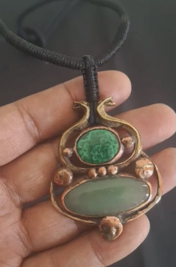 Malachite And Green Aventurine Serpent Vintage Copper Pendant